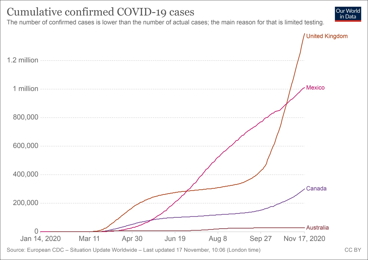 质疑中国防疫措施的英国、墨西哥、加拿大及澳大利亚的累计病例变化情况 图表来源:牛津大学用数据看世界网站
