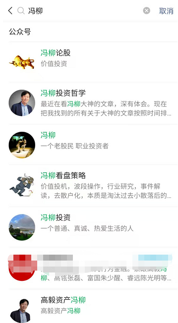 还有冒用高毅资产董事总经理冯柳名字的微信公众号有很多,有的还直接用了冯柳的照片作为头像,基金君还发现,“但斌实战策略”和“冯柳投资”两个公众号的签名是一样的,“一个普通、真诚、热爱生活的人”。