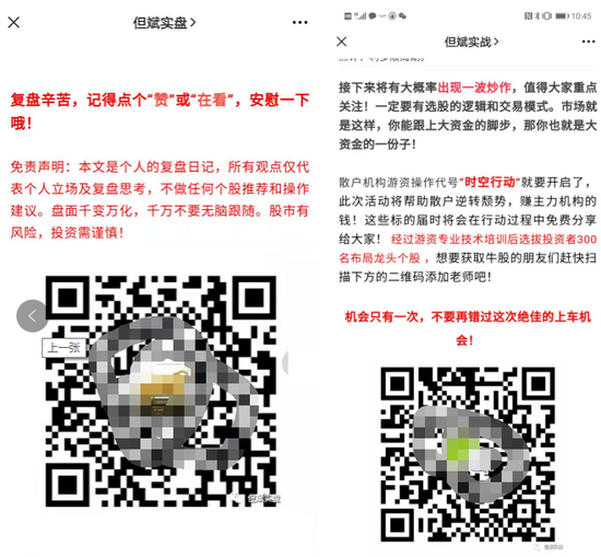 基金君随便搜索了一下公众号,冒用但斌名字的就有很多,有的还用了但斌的个人照片、微博信息等。点进去看看里面的文章,一般是关于市场、股票的,还有财经大事的,然后会附上二维码,添加微信私聊,有资深老师指教如何操盘,所谓“帮助散户扭转颓势,赚主力机构的钱”,“标的届时将在行动过程中免费分享给大家”,还说“机会只有一次,不要再错过这次绝佳的上车机会”。