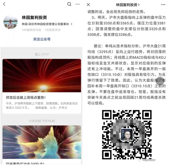 还有冒用“民间股神”林园名义的公众号,比如这个“林园复利投资”,签名是林园-深圳市林园投资管理有限公司董事长,其内容主要也是评论市场,然后引导投资者添加微信号,做投资指导。