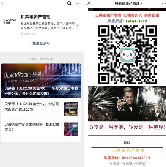 还有一个名为“贝莱德资产管理”的微信公众号,其头像就是贝莱德的logo,迷惑性很强,但后台一看是个人注册的。其文章里面写到“贝莱德资产管理 让相信的人 财务自由”,然后附上微信号,同样的套路。