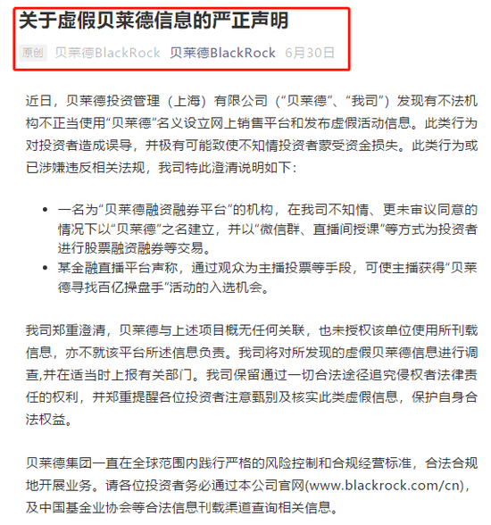 基金君发现,除了国内私募,还有模仿外资的。比如今年6月贝莱德在其微信公众号发表严正声明,贝莱德投资管理(上海)有限公司发现有不法机构不正当使用“贝莱德”名义设立网上销售平台和发布虚假活动信息。类行为对投资者造成误导,并极有可能致使不知情投资者蒙受资金损失。此类行为或已涉嫌违反相关法规。