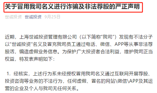 今年9月25日,上海知名私募世诚投资也发布了《关于冒用我司名义进行诈骗及非法荐股的严正声明》:发现有不法分子以“世诚投资”名义及冒充我司员工通过电话、微信、APP等从事非法荐股活动,编造虚假业务信息。