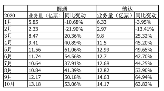 从目前的市场占有率来看,韵达和圆通分别位列第二和第三,均在15%以上。10月,韵达营收30.89亿元,同比增长10.24%,快递业务量14.17亿票,同比增加63.82%;圆通营收28.24亿元,同比增长17.59%,快递业务量13.18亿票,同比增长53.06%。