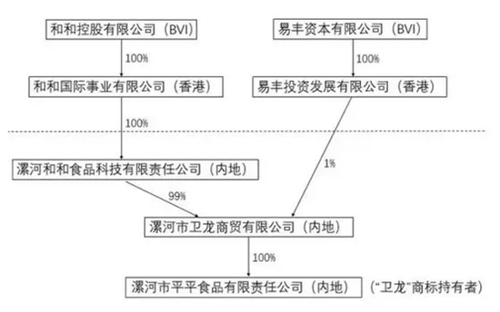 工商信息显示,漯河市平平食品有限责任公司的股权穿刺后股东已经变更为两家注册在英属维京群岛的公司——和和控股有限公司、易丰资本有限公司。