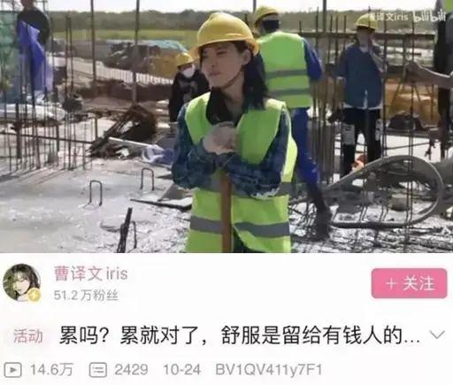 事情是这样的,一位名叫“曹译文iris”的B站up主发布了一段标题为《累吗?累就对了,舒服是留给有钱人》的Vlog。她一边说要体验建筑工人的辛苦,一边却在暗搓搓地炫富,最后成了“翻车”现场。
