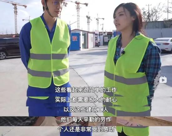 紧接着,这位博主乘专车前往建筑工地,一众领导接待后,又对其进行安全教育。之后她开始换上靴子、背心和头盔,准备进入工地。