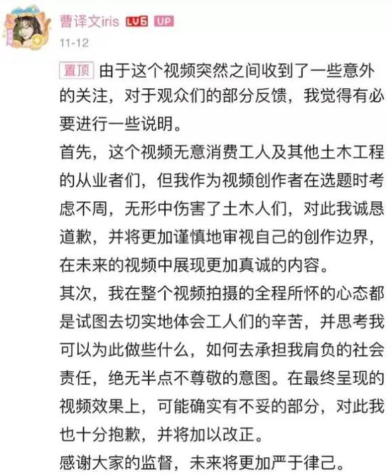 之后该博主发文致歉,表示自己无意消费工人及其他土木工程的从业者们,是自己选题时考虑不周,将更加谨慎地审视自己的创作边界。