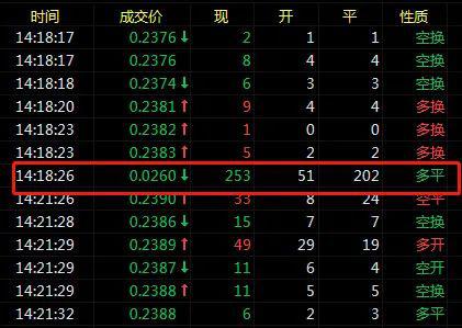 分时成交明细显示,今日14点18分有253手该合约在0.0260成交,而上一笔成交价为0.2383,瞬间暴跌89%,随后在14点21分成交价又回到了0.2390。