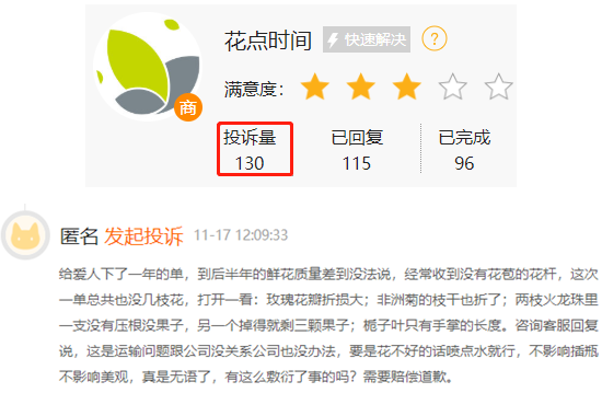 在黑猫投诉平台上,花点时间合计被投诉130次,中间大部分是针对收到的鲜花质量问题的,也有不少消费者表示对公司服务不满,称遇到产品问题客服不予处理。