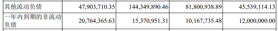 由于生产销售带不来足够的现金,还要持续消耗现金,因此中一科技只能靠借款维持,2017年短期借款4200万元,无票据融资。2020年短期借款达到2.02亿元,此外还有期限更短的票据融资5000万元,说明中一科技资金非常紧张。雪上加霜的是,有负债在一年内到期,金额几乎相当于中一科技现有的现金,也就是说,还完这笔负债,中一科技基本上没钱了,将面临现金流断裂的危险,必须上市融钱还债。