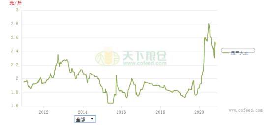 截止11月13日,国产大豆现货继续上涨,全国平均价位2.62元/斤,较去年同期1.775元/斤上涨47%,期货从10月1日的4400元/吨上涨到5350元/吨,上涨幅度较大。