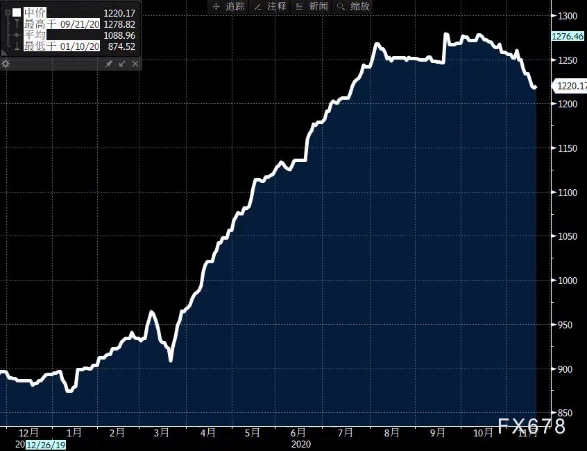 尽管如此,由于疫苗开发接连有好消息,金价仍连续第二周下跌。自从辉瑞和Moderna在过去两周发布了有关新冠疫苗的正面报导以来,金价已下跌了超4%。今年以来,黄金主要受益于疫情对经济造成的损害以及由此产生的全球刺激措施。