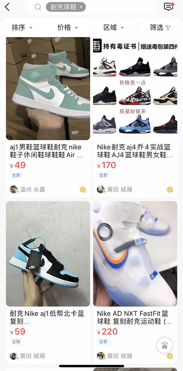 此外,界面新闻以“耐克球鞋”为关键词进行搜索后发现,各种原价几百或者上千元的球鞋都在以几十元的价格进行出售。而不少球鞋卖家也并不避讳自己出售的假冒商品,甚至在商家昵称中直接标注“复刻”、“莆田”等等暗示性词语。