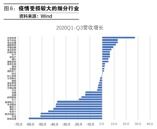 对比一下三季报各细分行业的营收增速可以发现,影视动漫、百货、航空、机场、酒店、餐饮和旅游(均选自申万二级子行业)受疫情冲击最大,它们前三季度经营增速分别为-61.2%、-51.6%、-51.3%、-45%、-40.5%、-38.6%和-37.4%。另外,保险板块也受到较大冲击,1-10月个险新单同比增速为负。这些板块2021年的业绩反弹力度将更大。