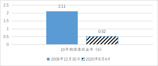 从政策性利率来看,两个时期美联储政策性利率水平基本一样。2020年3月底和2008年12月底一样,联邦基金利率基本是零利率。但无风险利率水平来看,两个时期存在巨大差异。2008年底美国10年期国债最低收益率为2.11%,2020年年初至今最低收益率是8月4日,仅为0.52%(图6)。