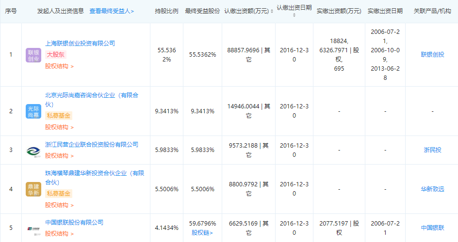 企查查信息显示,银联商务持股5%以上的股东分别为上海联银创业投资有限公司、北京光际尚嘉咨询合伙企业(有限合伙)、浙江民营企业联合投资股份有限公司、珠海横琴鼎建华新投资合伙企业(有限合伙)。