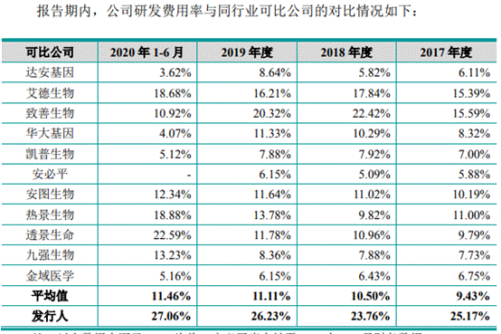 2017年-2019年及2020年上半年,睿昂基因研发费用分别为4336.65万元、5333.60万元、6701.12万元及3680.00万元,占当期营业收入的比例分别为25.17%、23.76%、26.23%及27.06%。同行研发费用率平均值分别为9.43%、10.50%、11.11%、11.46%。