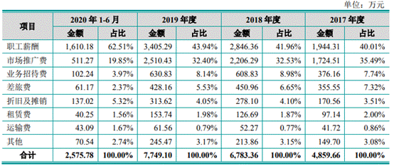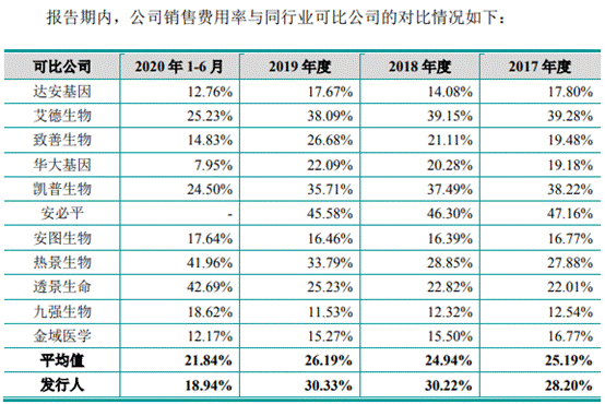 2017年-2019年及2020年上半年,睿昂基因销售费用分别为4859.66万元、6783.36万元、7749.10万元及2575.78万元,占当期营业收入的比例分别为28.20%、30.22%、30.33%及18.94%。同行销售费用率平均值分别为25.19%、24.94%、26.19%、21.84%。