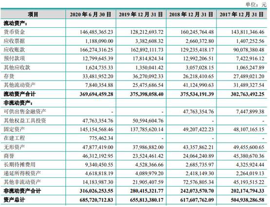 2017年-2019年及2020年上半年,睿昂基因资产总额分别为5.05亿元、6.18亿元、6.56亿元、6.86亿元。其中流动资产分别为3.03亿元、3.76亿元、3.75亿元、3.70亿元,占比分别为59.96%、60.80%、57.24%、53.91%。各期,睿昂基因货币资金分别为1.44亿元、1.60亿元、1.28亿元、1.46亿元。
