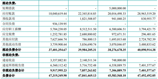 2017年-2019年及2020年上半年,睿昂基因负债总额分别为4749.25万元、4558.36万元、4784.15万元、4731.93万元。其中流动负债分别为4009.09万元、3827.67万元、3998.42万元、3740.14万元,占期末负债总额的比例分别为84.42%、83.97%、83.58%及79.04%。