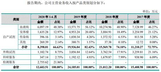 各期,自产分子诊断试剂收入占睿昂基因主营业务收入的比例分别为72.75%、74.10%、82.43%、66.63%。为公司带来收入的自产试剂主要包括血液病分子诊断试剂、实体瘤分子诊断试剂和传染病分子诊断试剂。