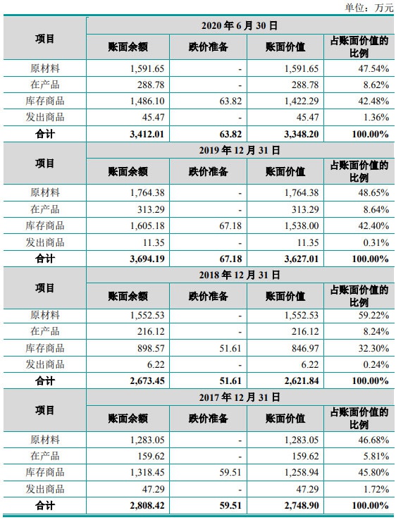 各期,公司库存商品分别为1258.94万元、846.97万元、1538.00万元、1422.29万元,占存货账面价值的比例分别为45.80%、32.30%、42.40%、42.48%。