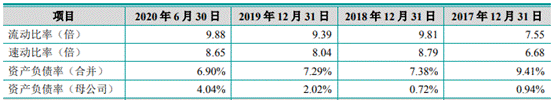 各期,公司资产负债率(合并)分别为9.41%、7.38%、7.29%、6.90%,流动比率分别为7.55、9.81、9.39、9.88,速动比率分别为6.68、8.79、8.04、8.65。