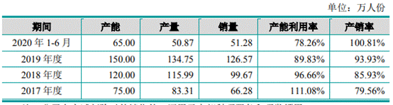 2017年-2019年及2020年上半年,睿昂基因产能分别为75万人份、120万人份、150万人份、65万人份,产能利用率分别为111.08%、96.66%、89.83%、78.26%,产销率分别为79.56%、85.93%、93.93%、100.81%。