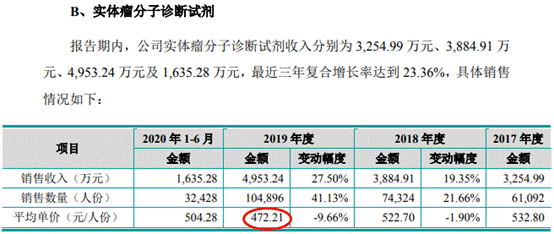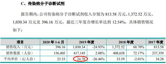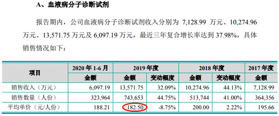 2017年-2019年及2020年上半年,睿昂基因血液病分子诊断试剂平均单价分别为195.66元/人份、200.00元/人份、182.50元/人份及188.21元/人份,实体瘤分子诊断试剂平均单价分别为532.80元/人份、522.70元/人份、472.21元/人份及504.28元/人份,传染病分子诊断试剂平均单价分别为34.28元/人份、33.59元/人份、24.70元/人份及25.33元/人份。