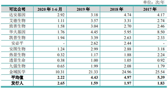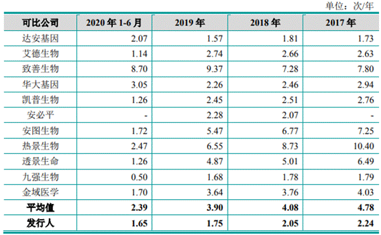 睿昂基因招股书称,在同行业可比公司中,致善生物、安图生物、热景生物、透景生命应收账款周转率相对较高,主要原因系上述公司以经销模式为主,经销客户的回款速度较快。若剔除上述公司,达安基因、艾德生物、华大基因、凯普生物、安必平、九强生物及金域医学应收账款周转率平均值分别为2.65次/年、2.44次/年、2.37次/年及1.84次/年,与公司应收账款周转率基本接近。