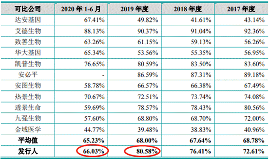 2017年-2019年及2020年上半年,睿昂基因综合毛利率分别为72.61%、76.41%、80.58%、66.03%,同行均值分别为68.78%、67.64%、68.00%、65.23%。