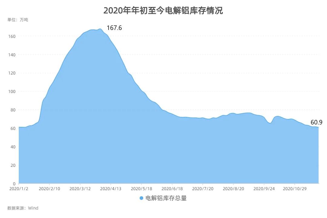 华安证券的研报显示,2020年10月,国内月均库存为68.92吨,同比下降21.78%,环比下降1.04%。进入11月以后,去库存延续,截至11月12日,SMM统计国内电解铝社会库存62.9万吨,周度下降2.5万吨。
