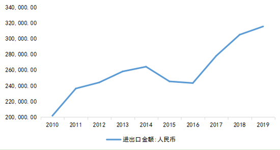 我们观察近十年进出口金额数据,可以看到我国进出口总额总体呈现增长态势,从2017年开始连创新高,2019年达到315504.80亿元。我国进出口贸易规模的日益扩大,人民币国际化功不可没。其一,人民币国际化给进出口贸易提供了便利环境,助力我国进出口贸易领域拓展,在对外开放政策支持下,我国进出口贸易规模扩大,同时人民币国际化降低了贸易过程中的成本,提高了我国对外投资竞争力;其二,人民币国际化减少贸易摩擦,从2018年开始的中美贸易摩擦对我国进出口贸易影响可以看出,贸易摩擦减少是我国进出口贸易稳定发展的重要保障。因此,人民币国际化优化了我国进出口贸易环境,同时降低了交易成本,能够促进我国对外贸易发展,并且这一作用力正在逐步增强。