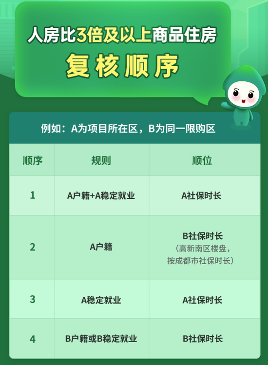 对此,成都住建解答称:举例来说,比如某一商品住房项目A盘共有房源100套,报名登记结束后,登记购房人数共1000户,开发企业开盘销售方案明确70套房源用于无房居民家庭选购,30套房源用于棚改货币化安置住户选购。以无房居民复核顺序为例,若无房居民家庭共有600户,则先对第一顺序的无房居民家庭(具有项目所在区户籍并在项目所在区稳定就业且连续缴纳社保)进行购房资格复核,复核后,若第一顺序的无房居民家庭户数超过210户(无房居民家庭房源数的3倍),则按其在该项目所在区同一住房限购区域稳定就业且连续缴纳社保的时间长短依次复核,直至第一顺序的无房居民家庭人数达到210户时,结束复核工作。