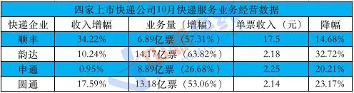 以顺丰为例,其10月速运物流业务营收同比增34.22%;业务量6.89亿票,同比增长57.31%;单票收入17.50元,同比下降14.68%。