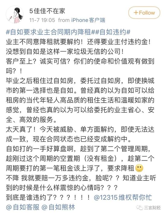 但是自如真的靠谱吗?就在最近,不断有业主反映自如要求业主合同期内降租,不同意就强制解约,还要赔偿违约金。租客也被下逐客令,并且不按合同赔偿。