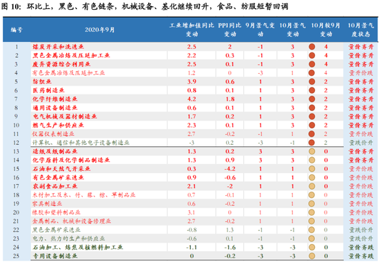 在10月当月,一共有25个行业,占比超过64%,景气度不亚于9月。我们依据工业行业景气度10月与9月边际变化,大致将行业分为以下几类(图10):
