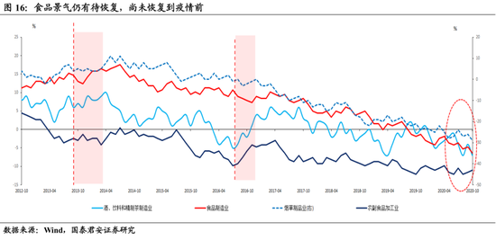 第二,景气持平于至疫情前,集中在受益于内外需共振回暖的行业,主要是基化(橡胶塑料)、机械(通用设备)、有色、食品饮料(农副食品)。