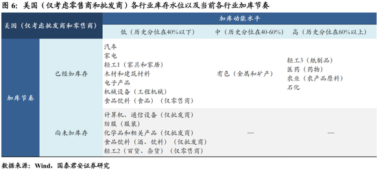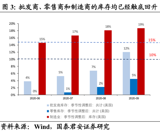 美国批发、零售环节加库将持续至明年5-6月份,制造业加库将持续至2022年。