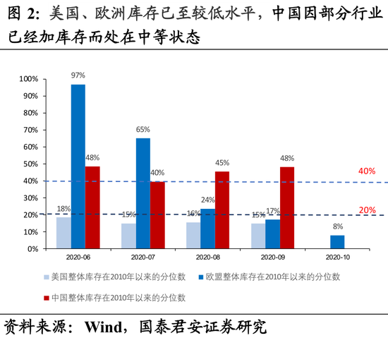 美国、欧洲库存已至低位,分别为自2010年以来的6%、8%分位,中国因部分行业已经加库存而处在中等状态(图2)。我们认为美欧库存未来反弹力度较大,中国至少存在一轮“弱补库周期”。2021年,中美欧三者库存周期有望再次同步启动。