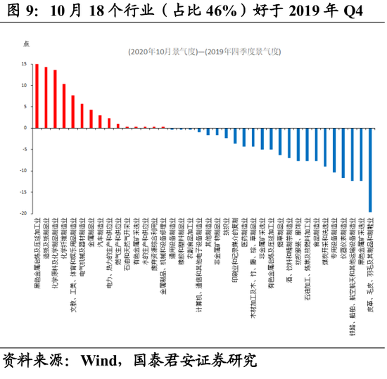 相比较2020年二季度,39个行业中,10月有26个行业(占比67%)景气度改善(图8);相比较疫前正常水平(2019年四季度),10月共有18个行业(占比46%)景气已经恢复至2019年四季度(图9)。相比之下,9月39个行业中,仅有22个行业(占比56%)景气度较二季度改善,12个行业(占比31%)好于2019年四季度。由此,虽然整体行业景气度有所回调,但内部行业复苏仍然不缺席。