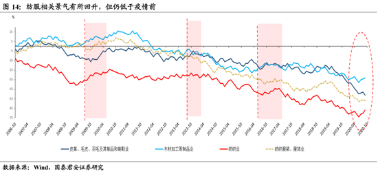 景气持平于至疫情前,集中在受益于内外需共振回暖的行业,主要是基化(橡胶塑料)、机械(通用设备)、有色、食品饮料(农副食品)(图13)。具体行业为: