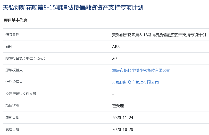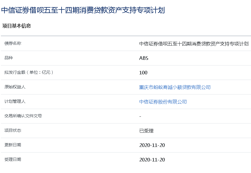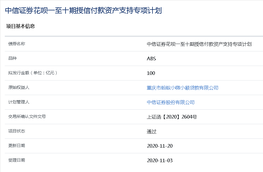 此外,拟发行规模同样为100亿元的“中信证券花呗一至十期授信付款资产支持专项计划”,在11月20日“通过”,这一原始受益人为“重庆市蚂蚁小微小额贷款有限公司”,受理时间为11月3日。