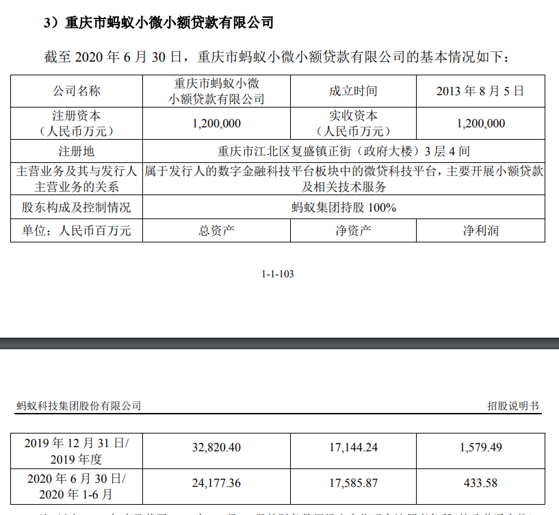 截至2020年6月底,重庆市蚂蚁小微小额贷款注册资本120亿元,总资产2.4亿元,上半年净利润433.58万元。
