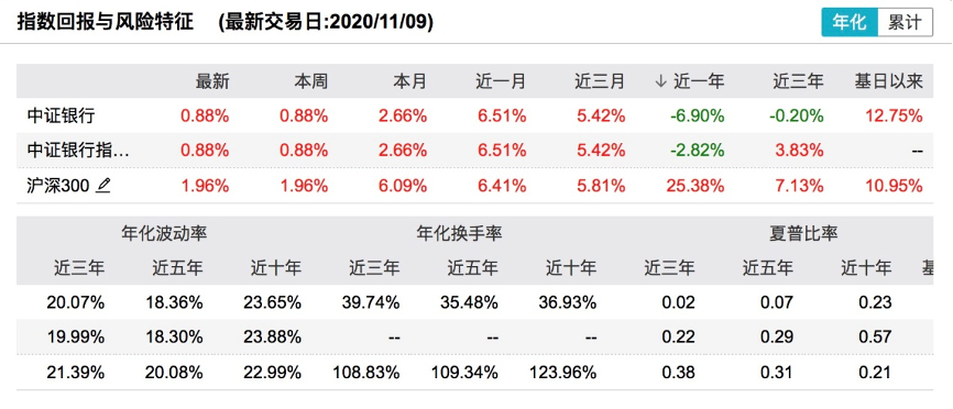 以中证银行指数(399986)为例,今年以来累计涨幅为-6.77%,而同期沪深300指数、上证指数涨幅高达19.48%、9.50%。(来源:wind,2020-11-17)