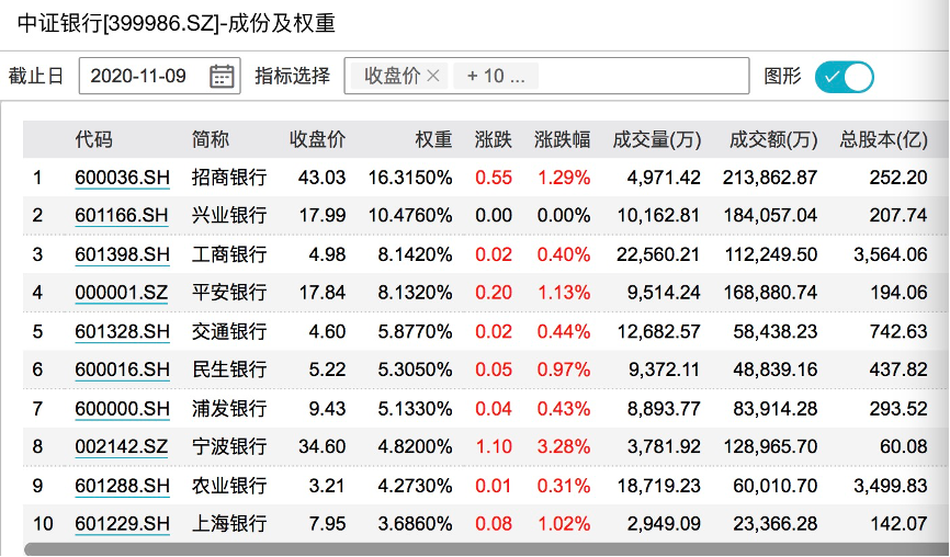 和同类银行指数相比,中证银行指数的优势相当明显,那就是覆盖面更广。目前中证银行指数的成份股共计36只,既包括工农建中交等国有大行,也包括招商银行、兴业银行、民生银行等股份行,同时还覆盖了北京银行、宁波银行、南京银行、江苏银行等城商行,以及苏农银行、渝农商行这类农商行。(来源:wind,2020-11-10)