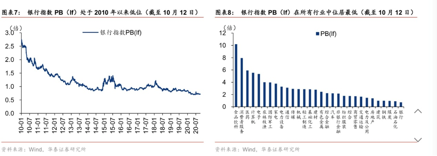 估值方面,2020 年以来经济下行压力压制了银行估值,截至10月12日,银行指数 PB(lf)仅为0.72倍。纵向来看,银行指数PB(lf)估值的近十年分位数为 3.00%,处于历史低位区间;横向来看,银行板块 PB(lf)、PE(ttm)均为30个申万一级行业中最低(分别为 0.72 倍、6.14 倍)。仓位方面,2020年6月末偏股型公募基金持仓银行股的比例仅有2.35%,较2020年3月末下降1.67pct,达到2014年末以来的历史低位水平。