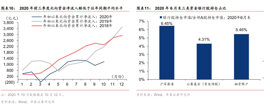 一是北向资金在四季度有望快速流入。从资金偏好角度看,外资对于高稳定度、高股息、高流动性的银行股更为青睐,因此前三季度外资增量下行或拖累行业景气度;9月末以来,富时罗素纳 A 扩容、QFII 与 RQFII 新规落地等政策利好外资入市,“十一”节后两个交易日北向资金大幅净买入247.8亿元。预计四季度外资有望加速流入,推动银行板块估值上行。(来源:华泰证券)