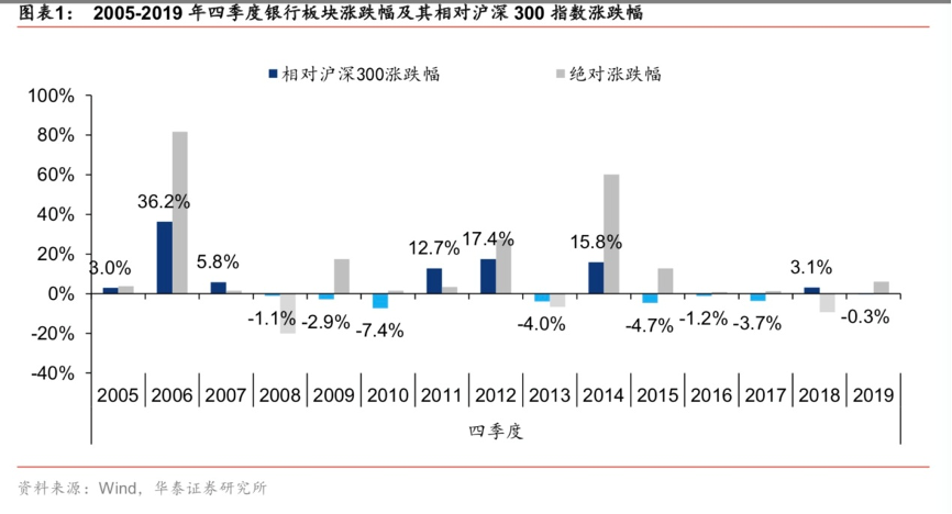 据华泰证券统计,银行板块在四季度股价表现一向都较为稳健,往往能够取得绝对收益。在2005年至2019年的共15个四季度中,银行股有12个季度绝对收益率为正,平均相对收益率为4.6%。